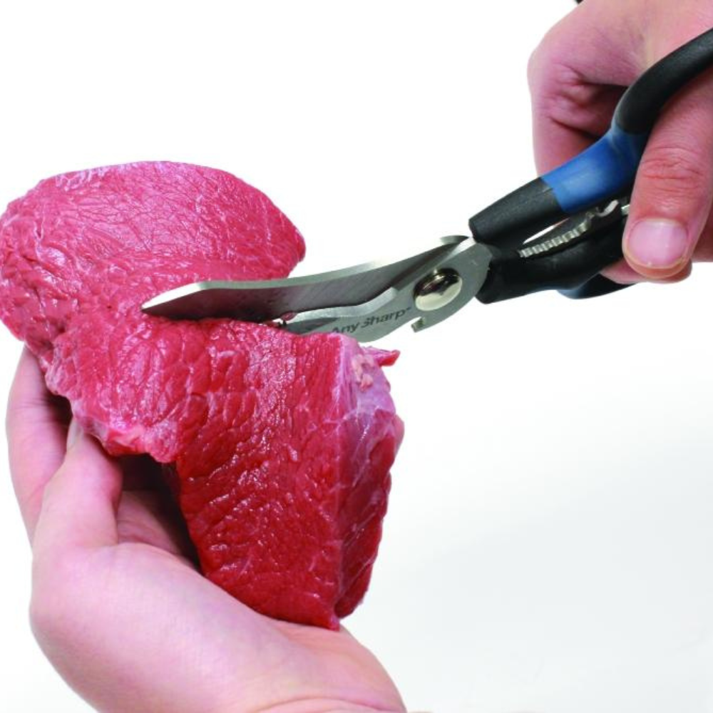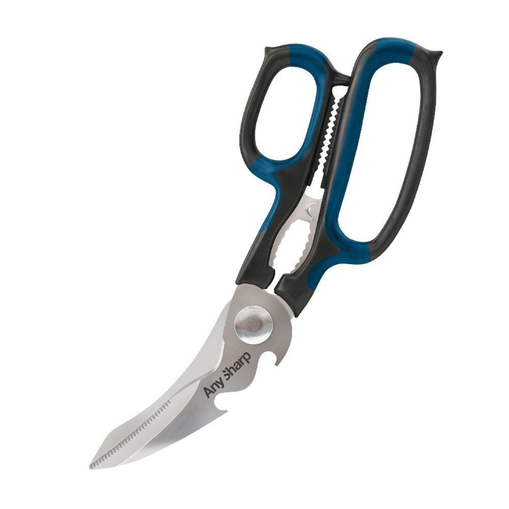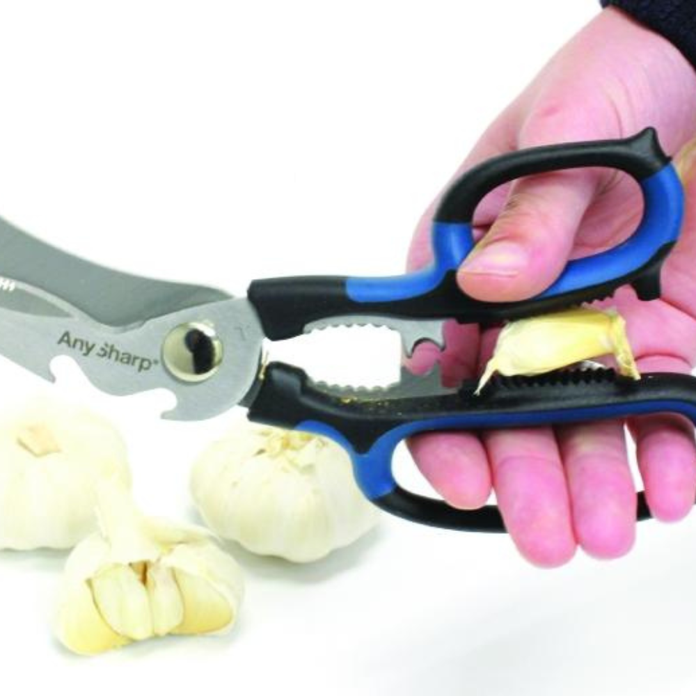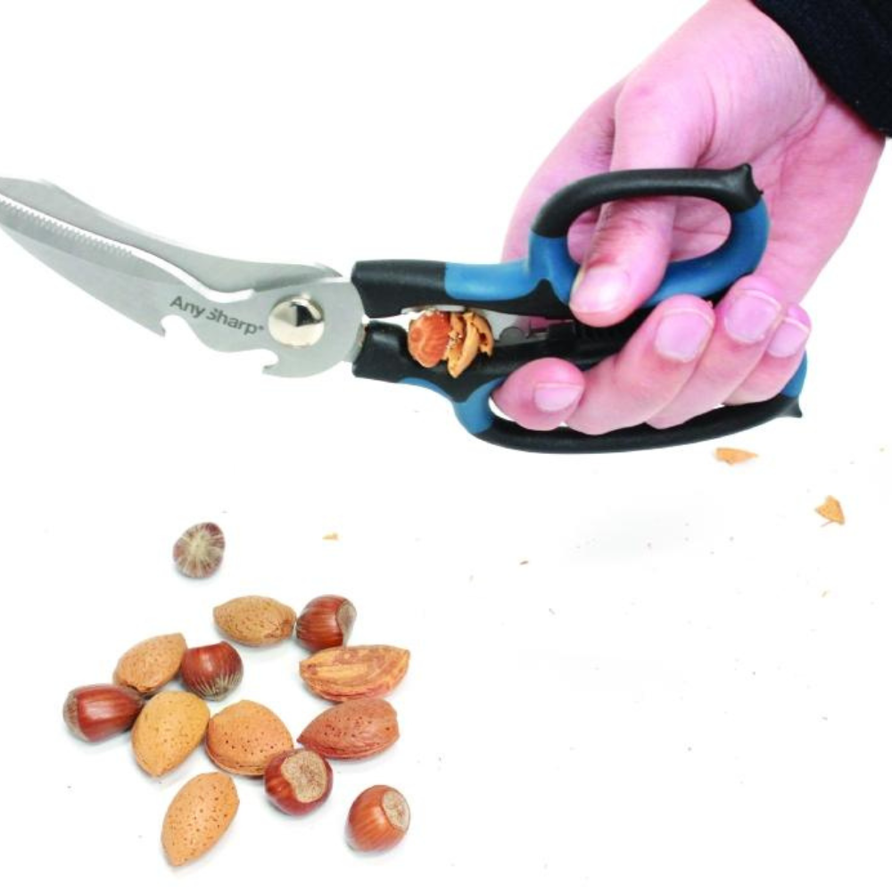 The AnySharp 5-in-1 Multifunction Scissors may be the only scissors you will ever need! Five handy tools all rolled into one: 1) “Cut-anything” scissors; 2) Bottle opener; 3) Garlic crusher; 4) Nut cracker; and 5) Wire stripper. These razor-sharp, hardened steel blades easily cut tough materials, such as blister packs, wire, cloth, carpet, meat, and even chicken bone!