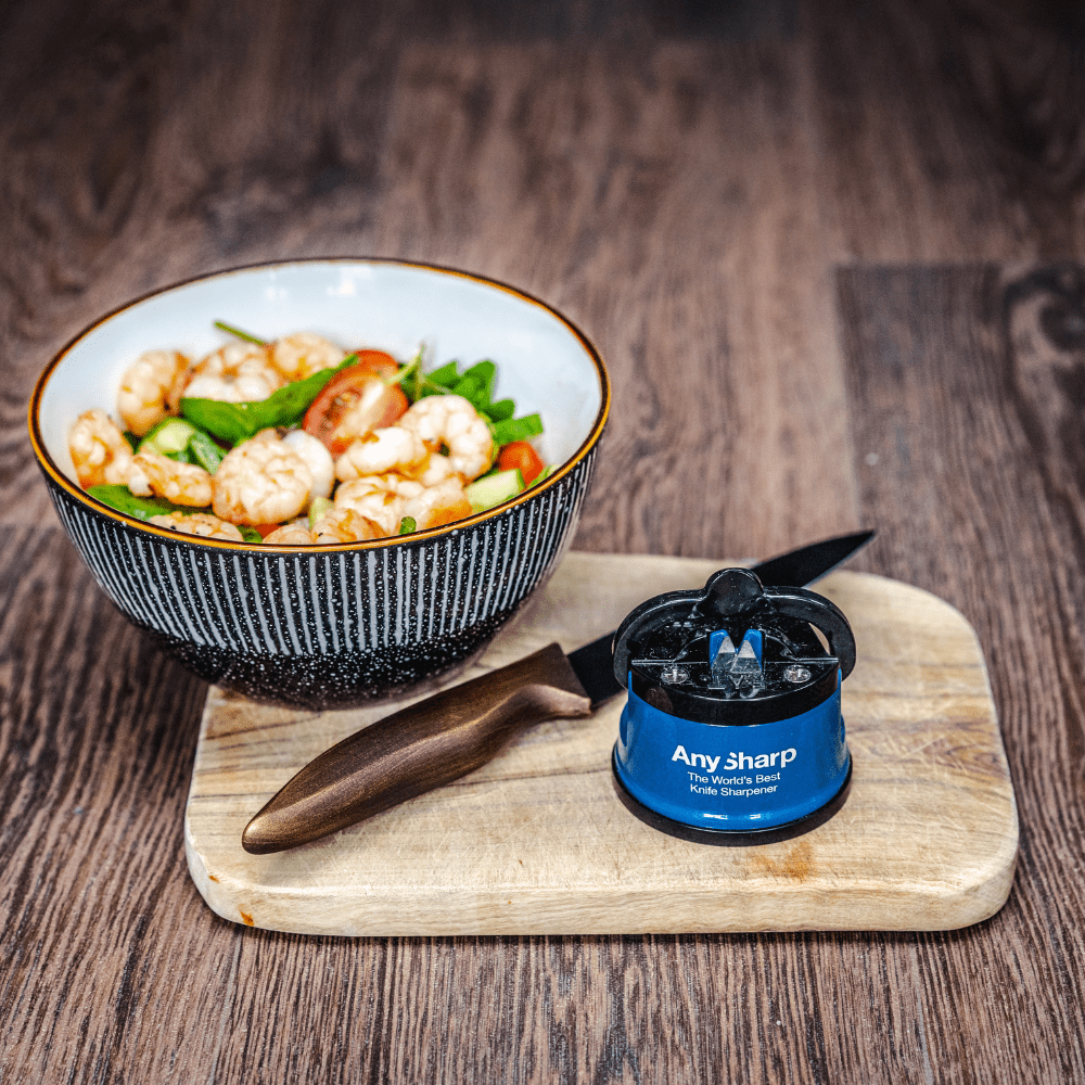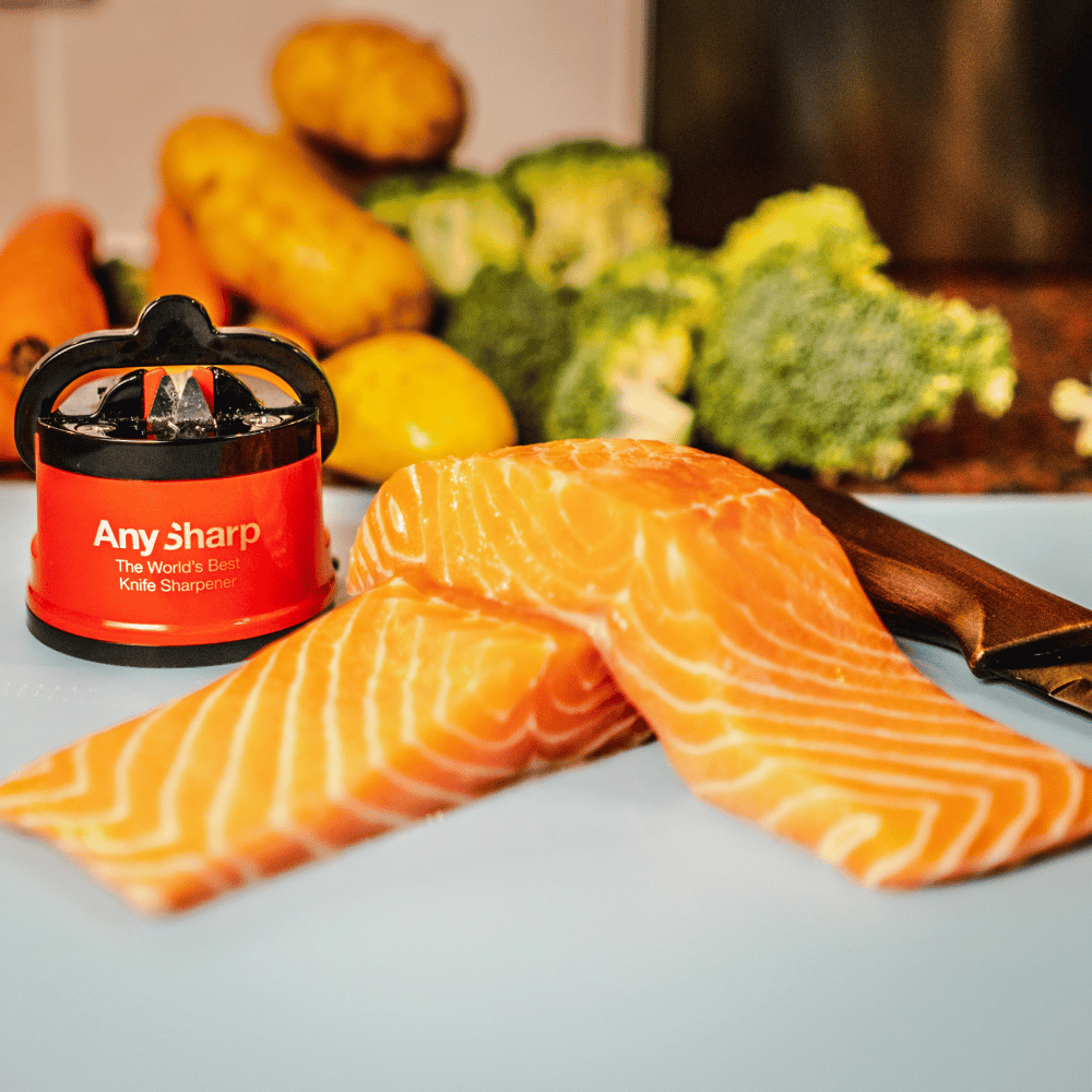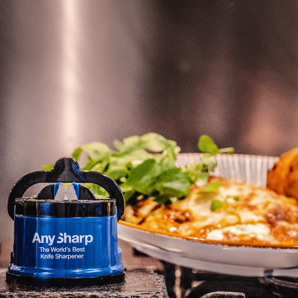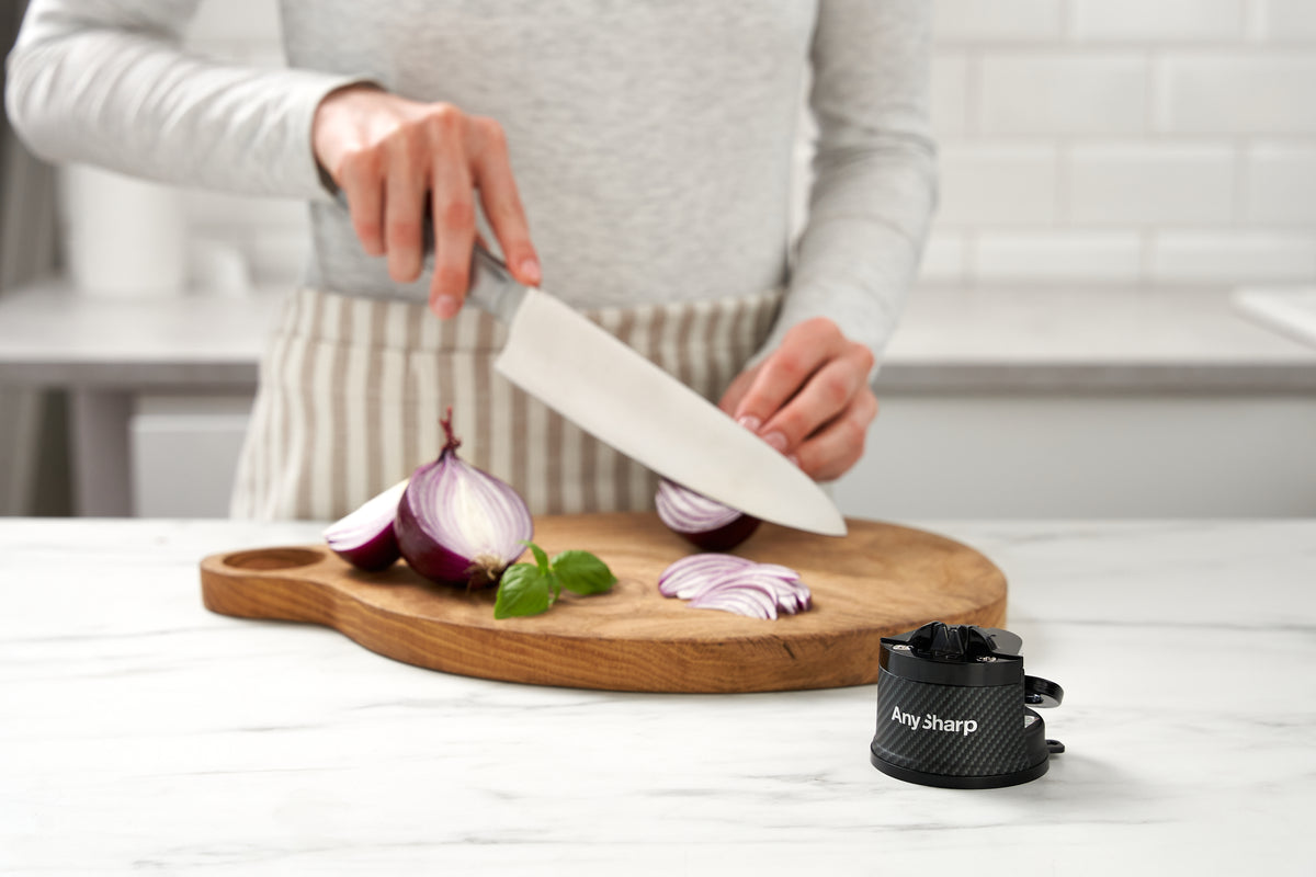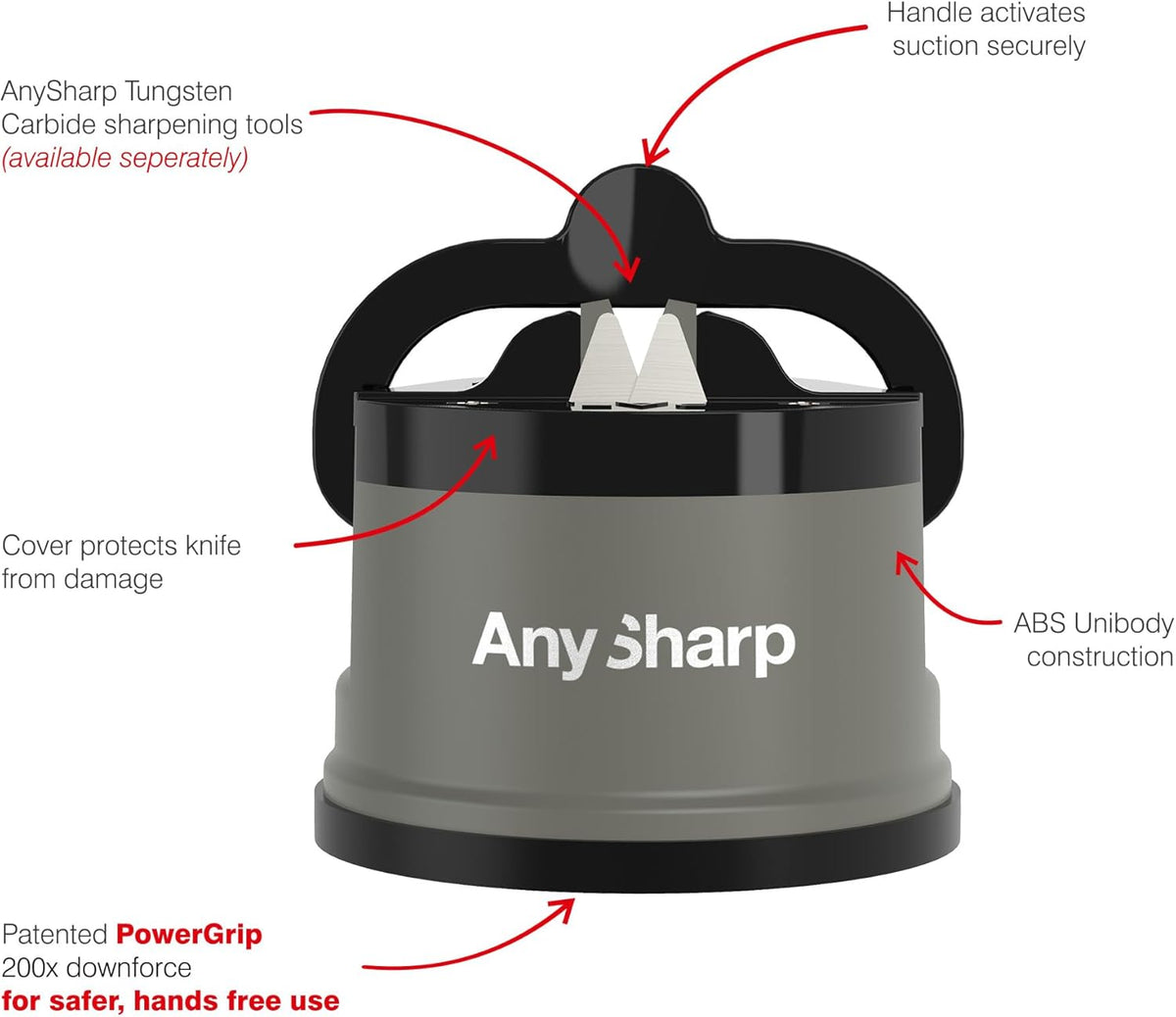 Known as the “World’s Best Knife Sharpener,” AnySharp Editions Knife Sharpener rejuvenates knives safely and hands-free. A few light strokes, and in seconds, the knife is sharp as new. The patented Power Grip suction cup base keeps the sharpener in place and the advanced diamond-honed Tungsten Carbide blades easily sharpen almost any knife. Professional-grade knife sharpening that helps make cooking easy and safe!